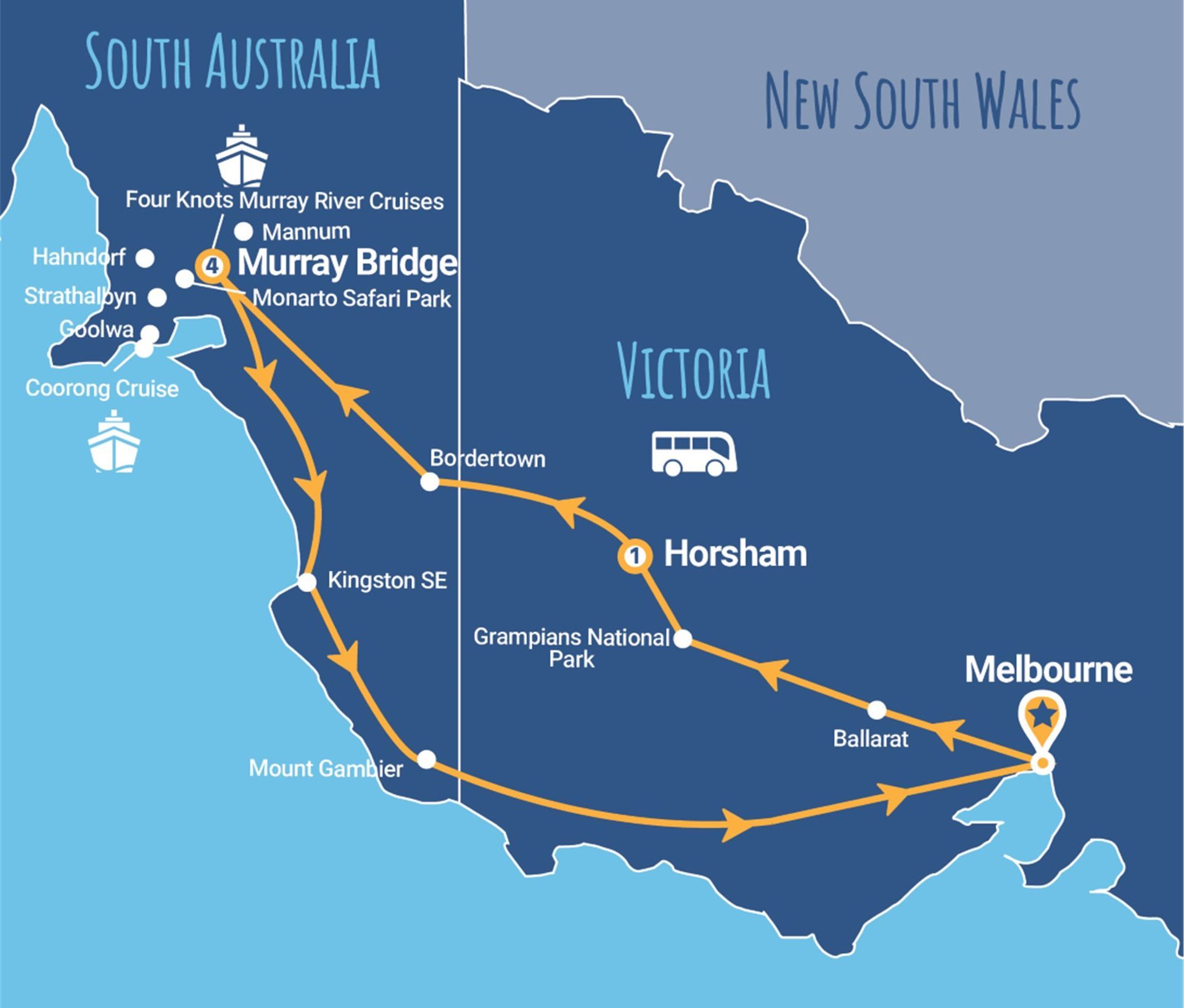 Boroka Lookout, Grampians National Park, Horsham Silo Art, Bordertown, Coonalpyn Silo Art, Monarto Safari Park, Hahndorf Adelaide Hills, Beerenberg Farm, The Cedars, The Coorong, The Murray River, Mannum, Kingston SE and Mount Gambier.