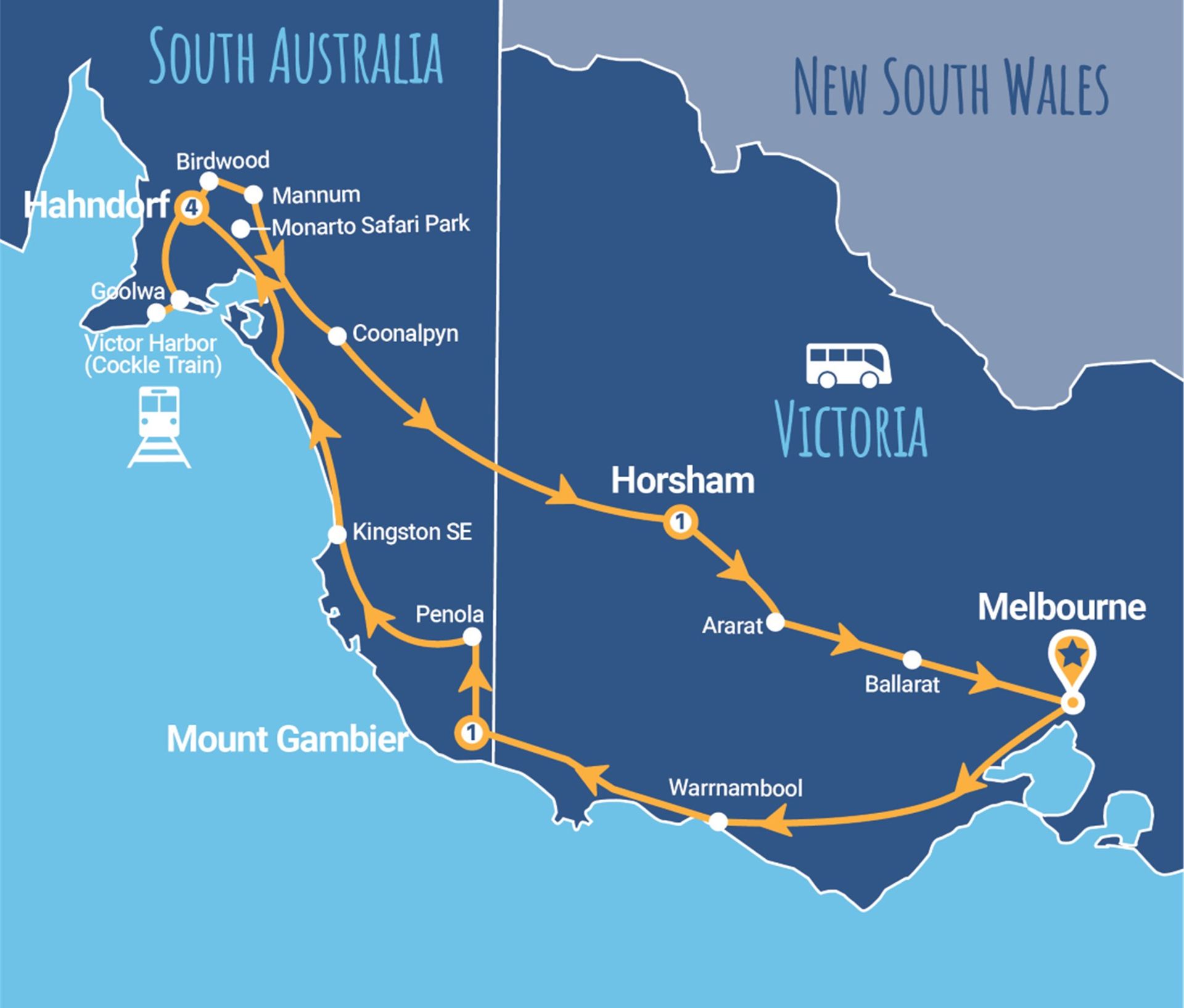 The Blue Lake, Mount Gambier, Mary MacKillop Penola Centre, Kingston SE, Hahndorf - Guided Tour, Strathalbyn, Goolwa, Victor Harbor, Monarto Safari Park, Lions 360 Experience, National Motor Museum Birdwood, Mannum, Coonalpyn, Horsham Silo Art and Gum San Chinese Museum Ararat.