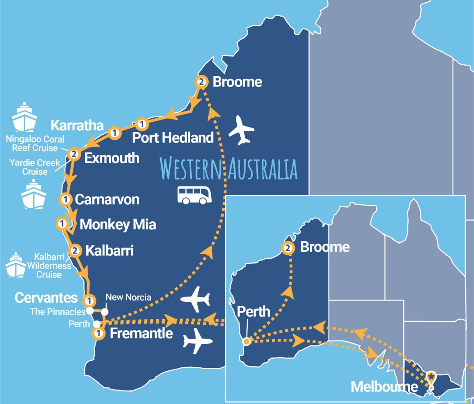 Broome sightseeing, Pearl Luggers Museum, Cable Beach, Eighty Mile Beach, Port Hedland, Karratha, Exmouth sightseeing, Tropic of Capricorn, Cape Range National Park, Hamelin Pool - Stromatolites, Telegraph Station, Monkey Mia - Dolphins, Kalbarri National Park - Natures Window, Geraldton sightseeing, Nambung National Park - Pinnacles and New Norcia.