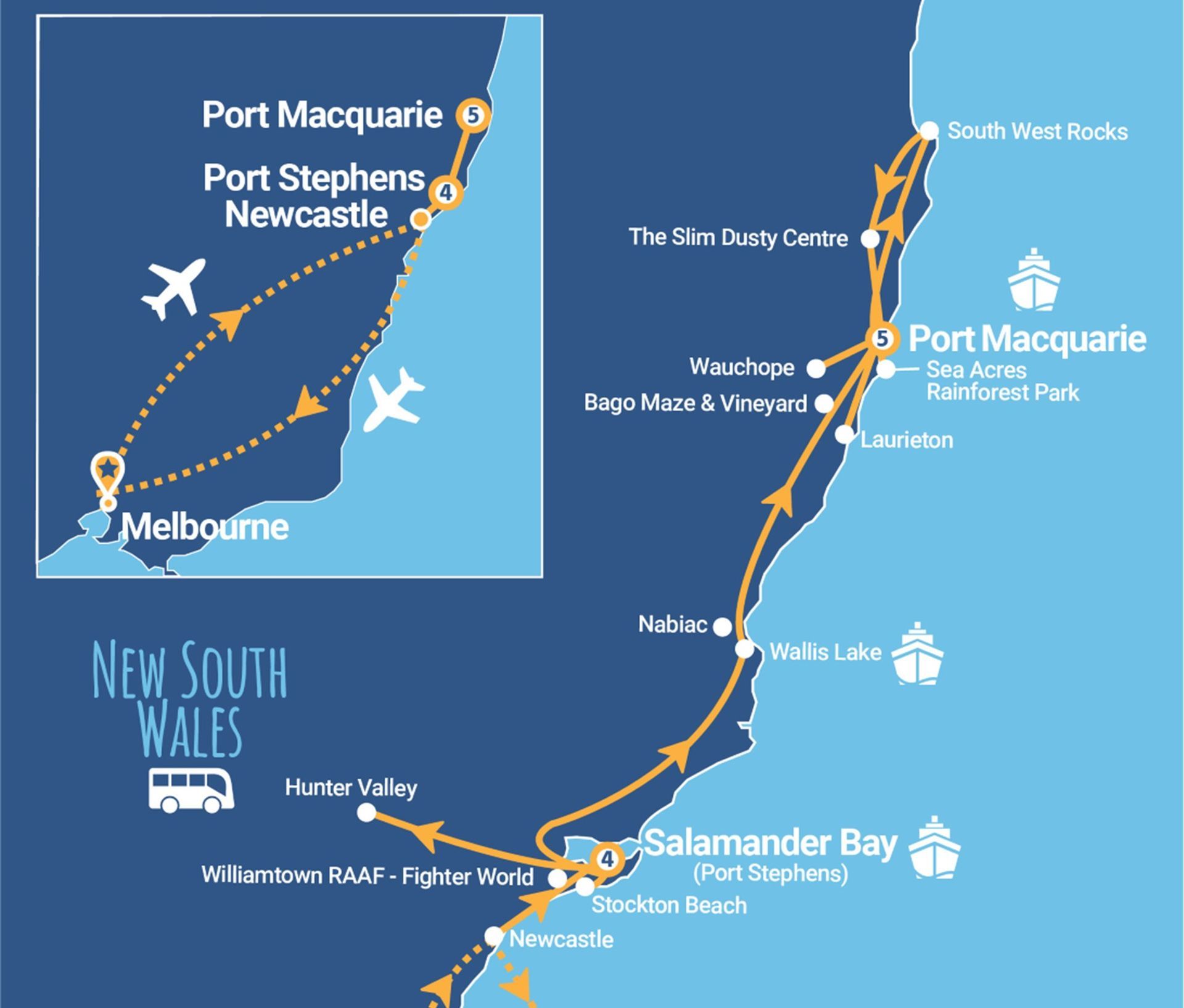 Nelson Bay and Tomaree Peninsula, Port Stephens, Stockton Bight Sand Dunes, Hunter Valley Gardens, Hunter Valley Cheese Factory, Tour of Newcastle, RAAF Fighter World, Forster - Tuncurry, Nabiac, National Motorbike Museum, Wild Koala Breeding Facility (Guulabaa), Sea Acres Rainforest Park, Cassegrain Winery, South West Rocks, Trial Bay Gaol, Slim Dusty Centre, Wauchope - Timbertown, Vickers Fudge and Bago Vineyards and Maze.