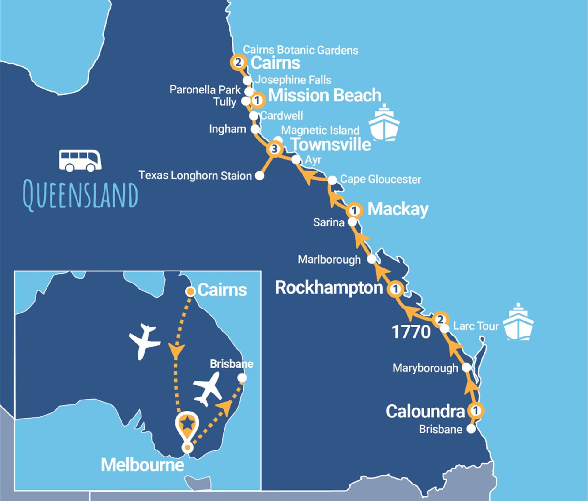 Gallipoli Memorial, Maryborough, Larc Day Tour 1770, Rockhampton Botanic Gardens & Zoo, Koorana Crocodile Farm, Marlborough Historical Museum, Sarina Sugar Shed, Cape Gloucester Resort Hideaway Bay, Big Python Ayr, Guided Bus Tour of Magnetic Island, Texas Longhorn Station, Old Ingham Cemetery, Bush Telegraph Cardwell, Golden Gumboot in Tully, Mission Beach, Charley’s Chocolate Factory, Paronella Park Josephine Falls and Cairns Botanic Gardens.