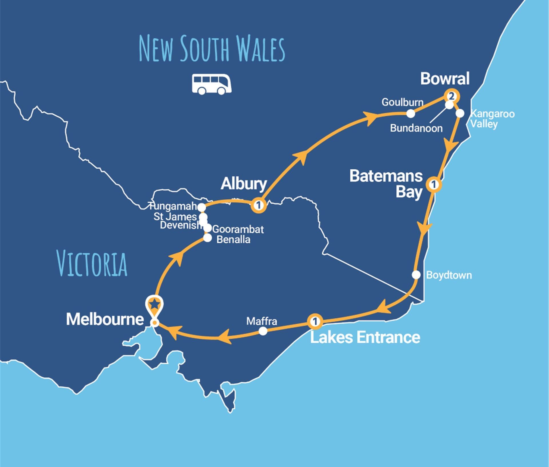 Benalla Murals, Goorambat Silos, Sophia Mural, Devenish Silos, St James Silos, Tungamah Silos, Garroorigang Historic Home Goulburn, Brigadoon Highland Gathering, Illawarra Fly Tree Top Walk, Fitzroy Falls Visitor Centre, Seahorse Inn Boydtown and Nyerimilang Heritage Park Lakes Entrance.