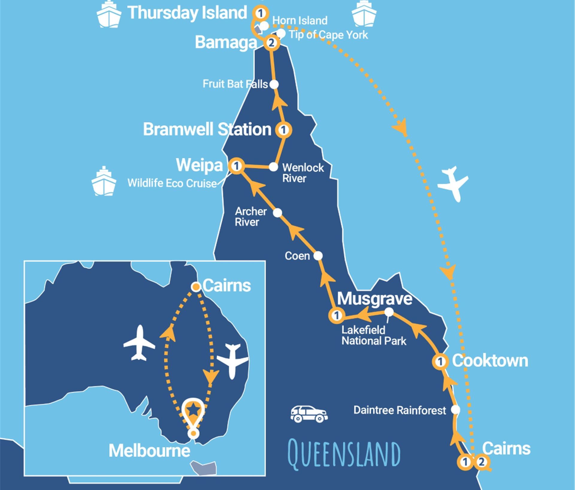 Cooktown, Lakefield National Park, Coen, Archer River, Jardine River, Musgrave Telegraph Station, Weipa, Bramwell Station, Fruit Bat Falls, Cape York, Guided Bus Tour on Thursday Island, Guided Bus Tour on Horn Island, Torres Strait Heritage Museum and Cairns.