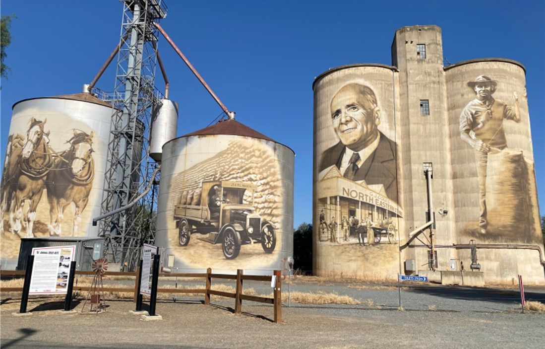 Nagambie, Christmas Lunch at Mitchelton Winery, Colbinabbin Silo Art, Tungamah Silo Art, St James Silo Art, Devenish Silo Art, Goorambat Silo Art, Benalla Street Art with guide, Tatura Irrigation and Wartime Camps Museum, Rochester Historical Society, Rochester Silo Art, Kyabram Water Tank Art, Mooving Art Shepparton and Marysville.