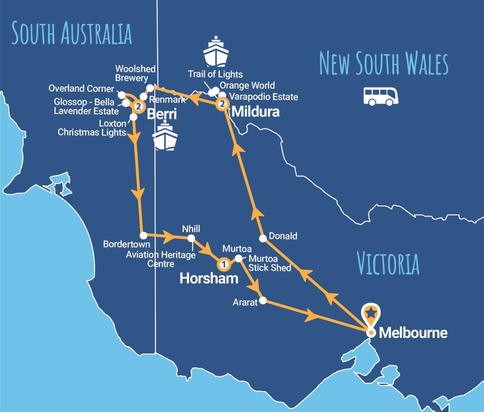 Guided tour of Mildura, Varapodio Estate, Orange World, Trail of Lights, Woodsies Gem Shop, Woolshed Brewery, Angove Winemakers, Overland Corner, Bella Lavender Estate, Loxton Christmas Lights, Aviation Heritage Centre and Murtoa Stick Shed.