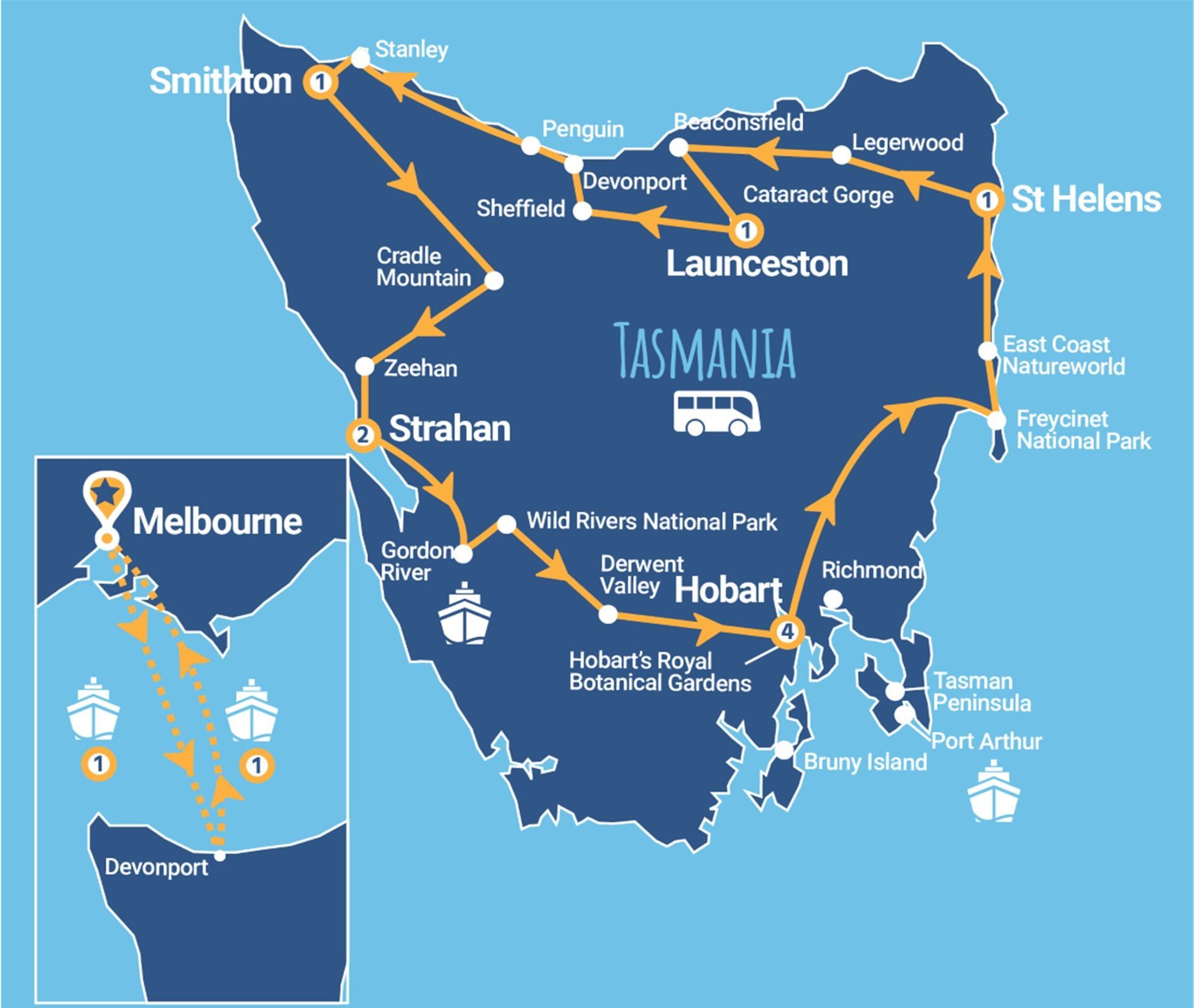 Port of Devonport, The Nut Stanley, Cradle Mountain National Park, Strahan, Franklin-Gordon Wild Rivers National Park, Nelson Falls, Wall in the Wilderness, Salamanca Markets Hobart, Richmond, Royal Botanical Gardens Hobart, Tasman Peninsula, Port Arthur Convict Settlement, Bruny Island, Spiky Bridge, Freycinet National Park, East Coast Natureworld, War Memorial Tree Carvings Legerwood, Mine & Heritage Centre Beaconsfield, Cataract Gorge Launceston, Tasmanian Gourmet Sauce Company, Sheffield Murals and House of Anvers Chocolates.