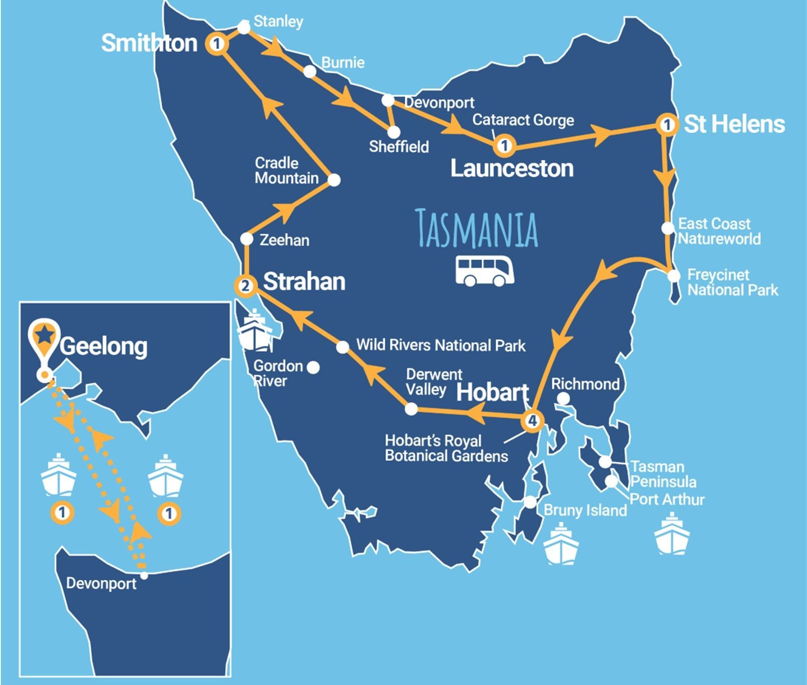 Woolmer’s Estate, Cataract Gorge Launceston, Mine & Heritage Centre Beaconsfield, Bridestowe Lavender Estate, War Memorial Tree Carvings Legerwood, East Coast Natureworld, Spiky Bridge Swansea, Freycinet National Park, Port Arthur Historic Site, Tasman Peninsula, Salamanca Markets, Royal Botanical Gardens Hobart, Bruny Island, Inala Jurassic Garden Bruny Island, Wall in the Wilderness, Nelson Falls, The Ship that Never Was Strahan, Franklin-Gordon Wild Rivers National Park, The Nut Stanley, Cradle Mountain National Park, Sheffield Murals and House of Anvers Chocolates.
