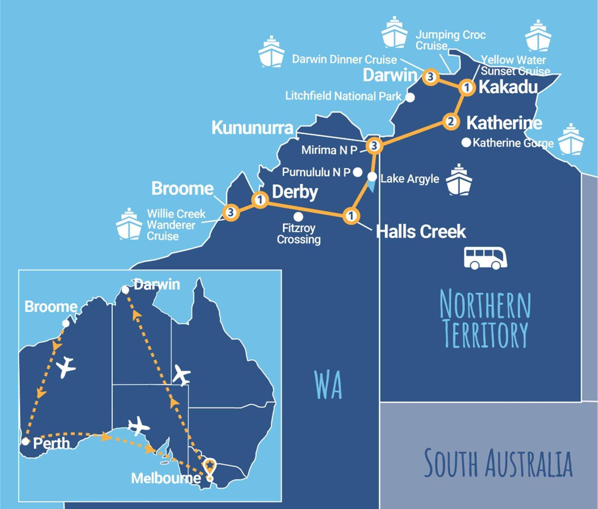 Guided Tour of Darwin, Royal Flying Doctors Service Tourist Facility, Adelaide River War Cemetery, Litchfield National Park, Kakadu National Park, Katherine - Katherine Gorge, Kununurra, Mirima National Park, Kimberley Ornamental Stonecraft, The Hoochery Distillery, Halls Creek,