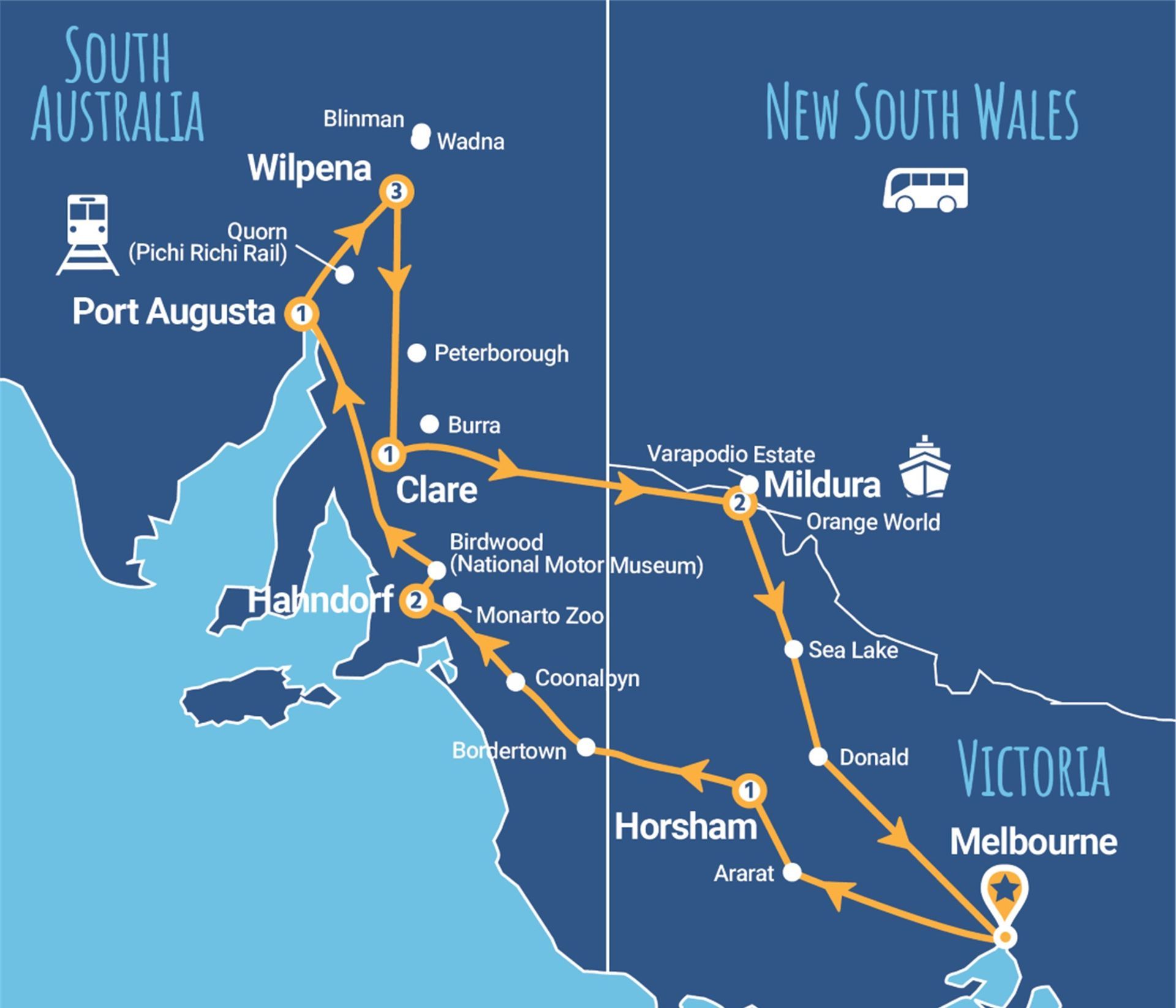 Horsham, Kaniva and Coonalpyn Silos, Monarto Safari Park, Lions 360 Experience, National Motor Museum, Birdwood, Flinders Ranges touring, Stokes Hill, Blinman Heritage Mine Tour, Wadna Art Gallery, Steamtown Heritage Rail Centre Peterborough, Tour of Burra, Tour of Mildura, Varapodio Estate, Orange World and Sea Lake Silos.