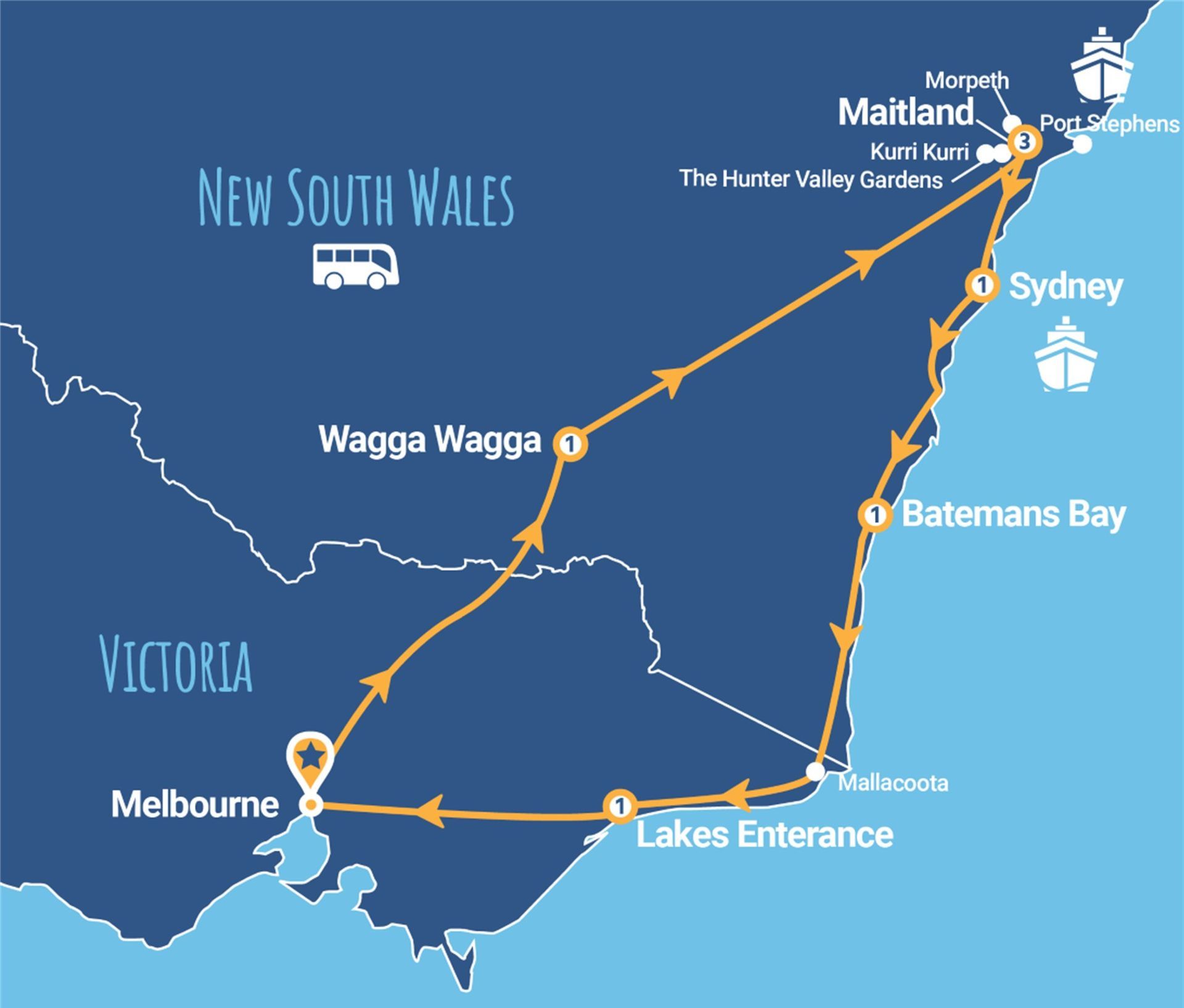 Kurri Kurri Mural Art, Hunter Valley Gardens, Christmas Lights Spectacular, Guided tour of Maitland, Morpeth, Kiama, Berry, Operation Bunker, Mallacoota and Lakes Entrance.