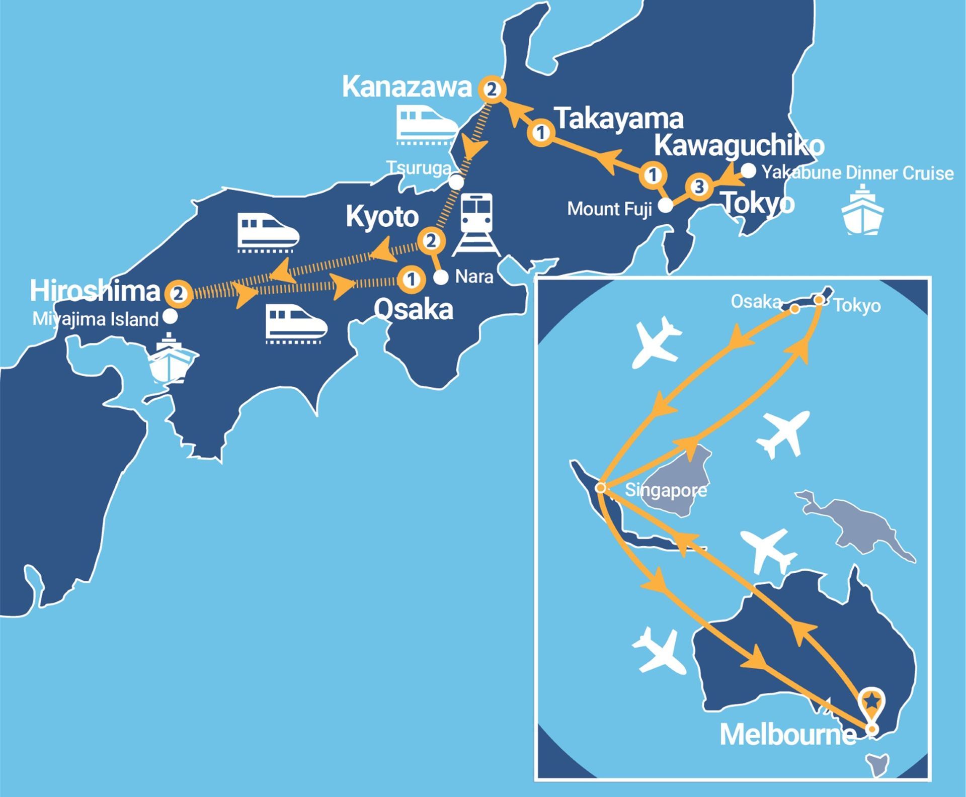 Melbourne to Tokyo via Singapore and Osaka to Melbourne via Singapore. Economy flights with Singapore Airlines include transfers and taxes.