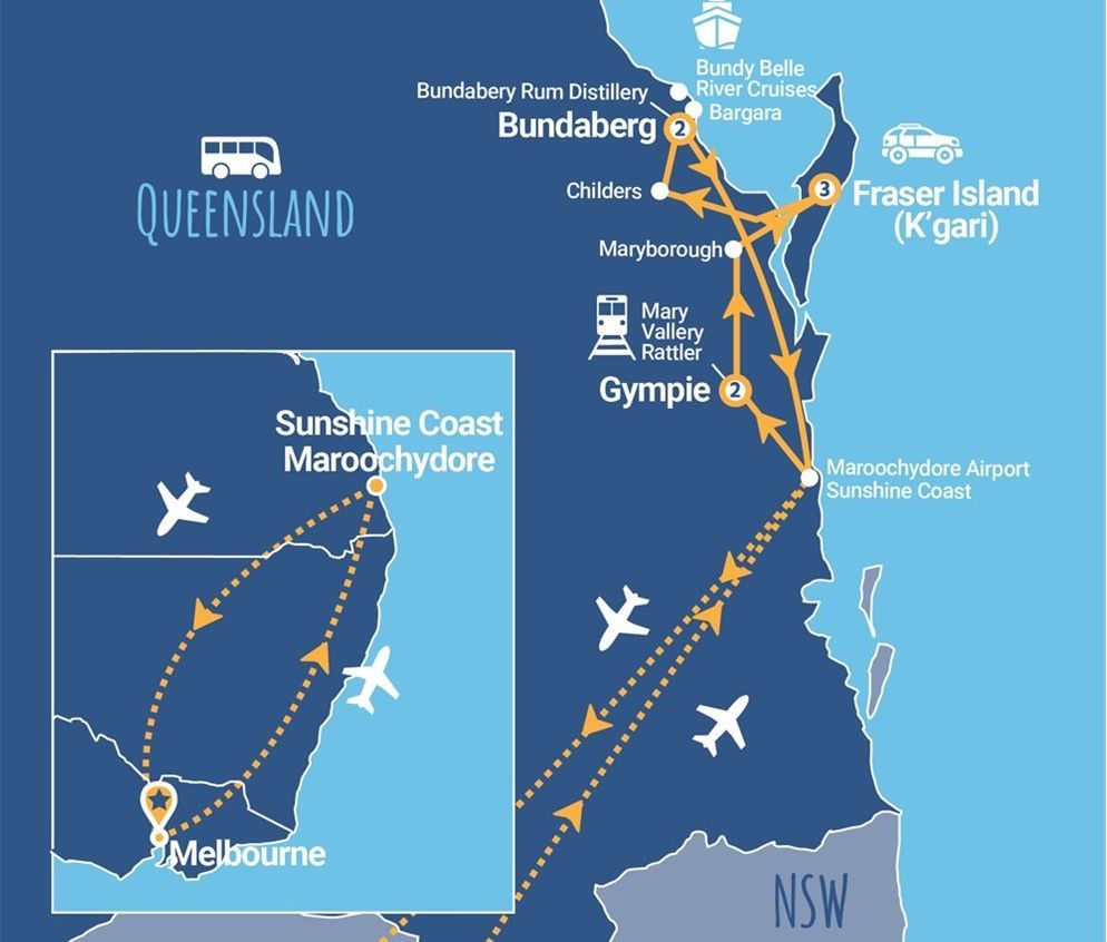 Gold Mining Museum Gympie, Local Guided Tour of Maryborough, Fraser Island, 4WD Beauty Spots Tour Fraser Island, Amandine Lavender Farm, Bundaberg Botanical Gardens, Hinkler Hall of Aviation and Bundaberg Rum Distillery Tour.
