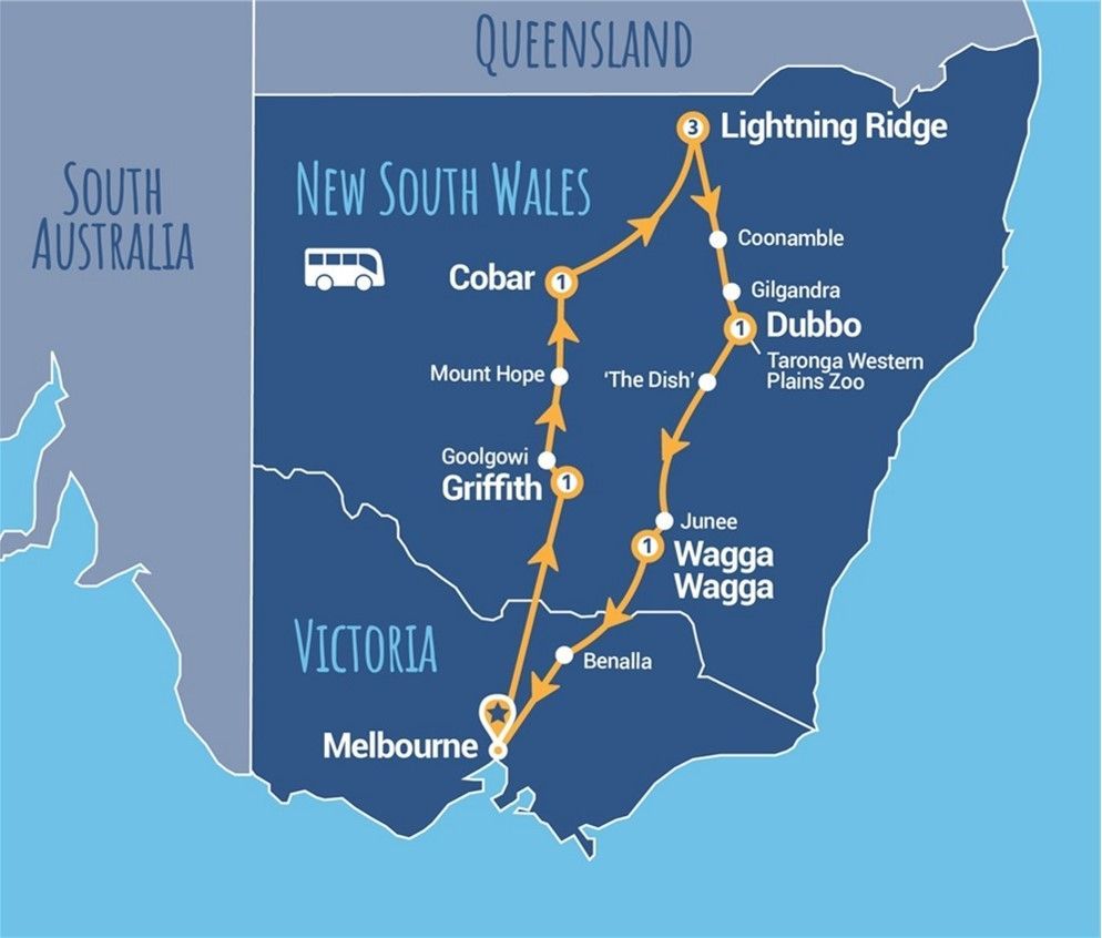 The Big Strawberry, Griffith Town Tour, Kidman Way, Great Cobar Outback Heritage Centre, Back of Bourke Exhibition Centre, Lightning Ridge Guided Tour, Chambers of the Black Hand, Opal Mine Adventure, Cactus Farm, Amigos Castle, The Grawin, John Murray Art Gallery, Dubbo, Taronga Western Plains Zoo, CSIRO Radio Telescope ”The Dish”, Junee Licorice and Chocolate Factory and Benalla Street Art.