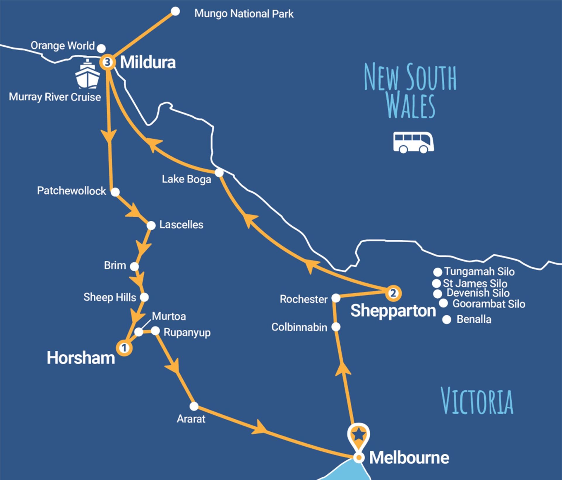 Colbinabbin Silos, Rochester Wall Art, Rochester Silos, Tungamah Silos, St James Silos, Devenish Silos, Goorambat Silos and “Sophia” Mural, Benalla Street Art, Catalina Flying Boat Museum, Mildura, Varapodio Estate, Orange World, Mungo National Park, Patchewollock Silo, Lascelles Silos, Woomelang Silos, Rosebery Silos, Brim Silos, Sheep Hills Silos, Horsham Silos, Murtoa Silo, Murtoa Stick Shed and Rupanyup Silos.