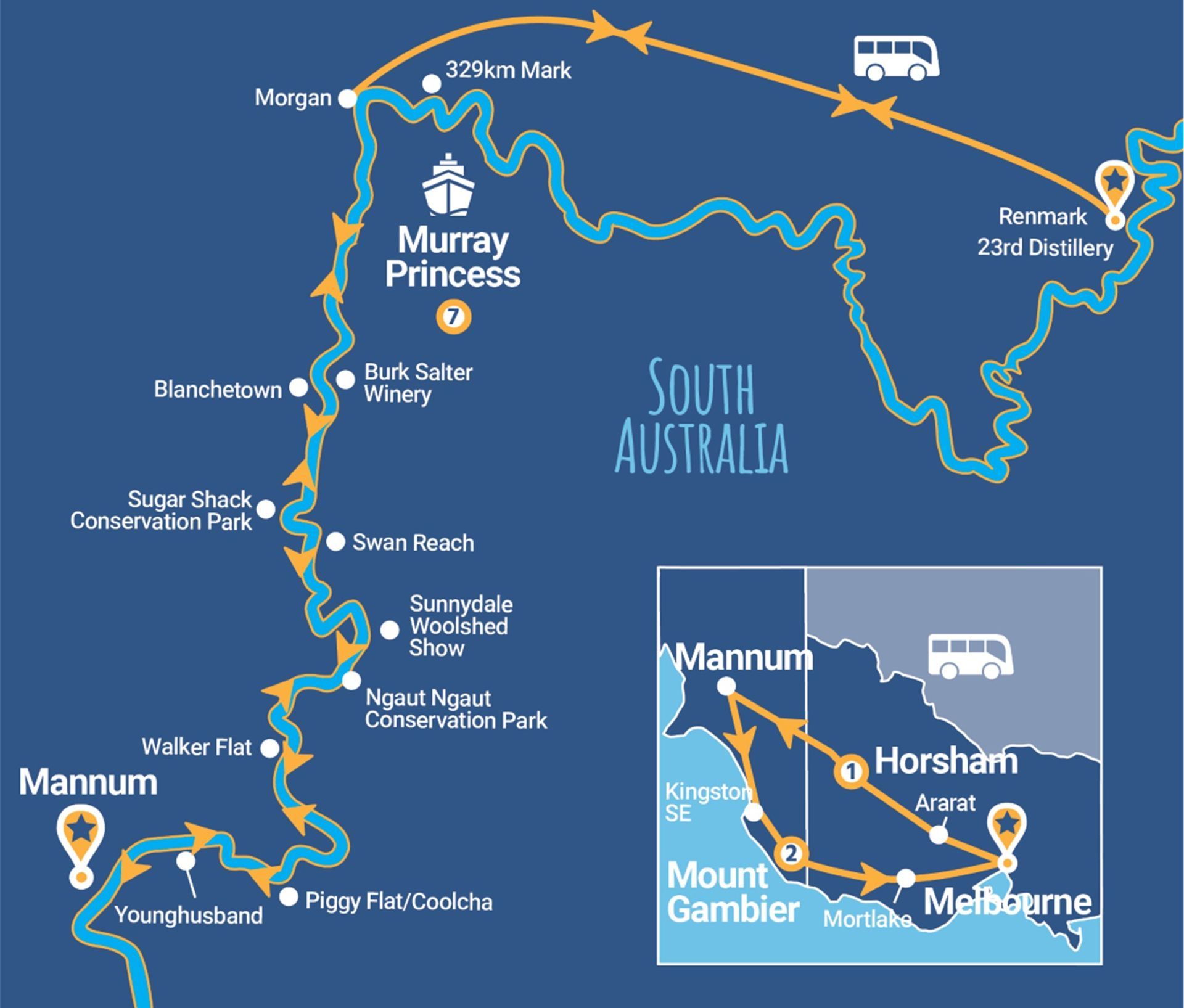 Mannum, Christmas in July Lunch, Morgan by Night Historic Walk, Renmark Paringa Community Museum, 23rd Street Distillery, Guided walk of Morgan township, Burk Salter Boutique Winery, Swan Reach, Sunnydale Woolshed Show, Native Wildlife Shelter, Ngaut Ngaut Conservation Park, Kingston S.E., Blue Lake Pumping Station, Mount Gambier Old Courthouse, Umpherston Cave and Caroline Hills Winery.