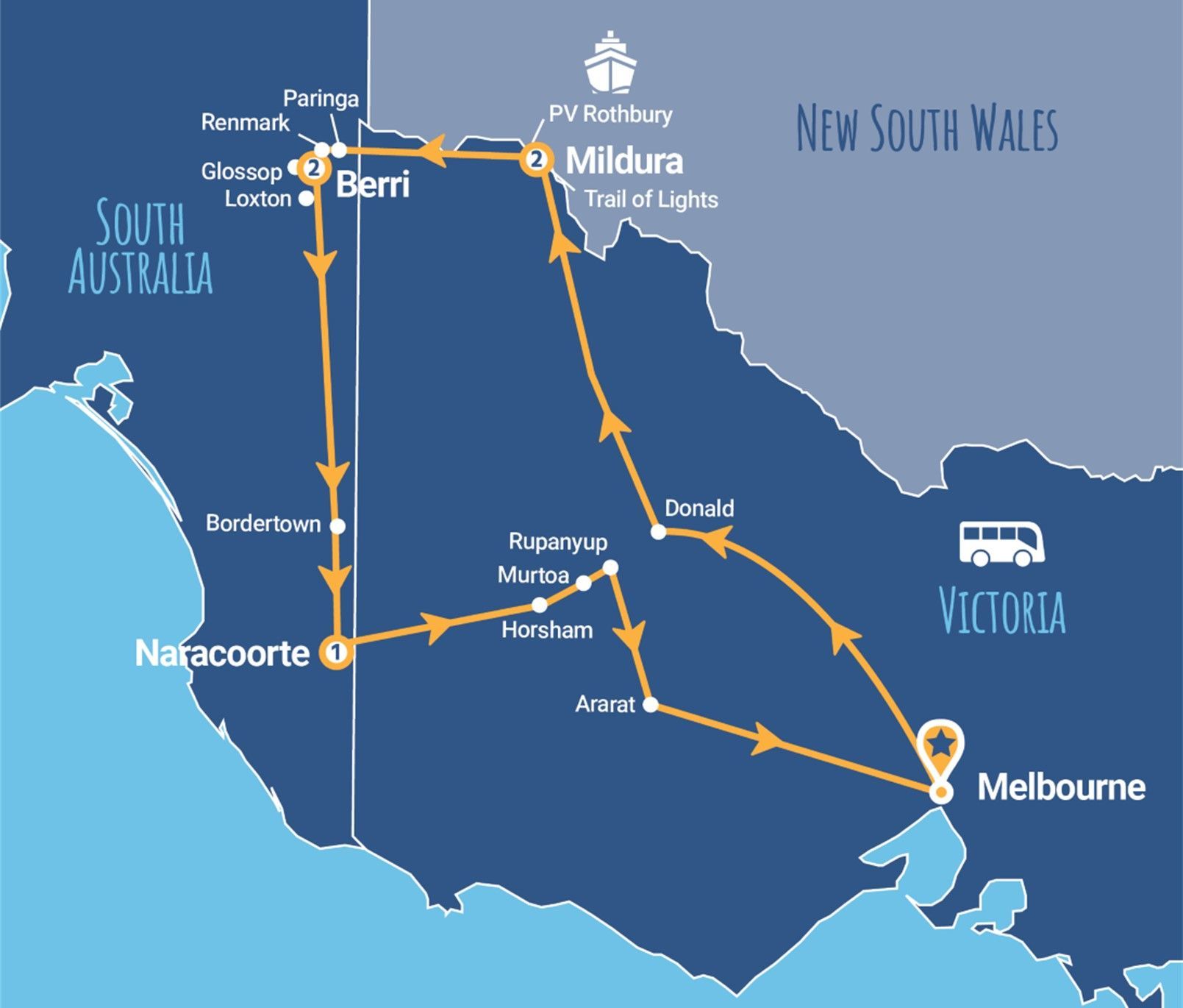 Tour of Mildura Rio, Vista Historical Museum, Mildura Trail of Lights, Paringa Silo Art, Renmark, Olivewood Homestead, Angoves Wines, Loxton Historical Village, Bella Lavender Estate, Wonambi Fossil Centre Naracoorte, Alexandra Cave, Horsham Silo Art, Murtoa Silo Art and Rupanyup Silo Art.