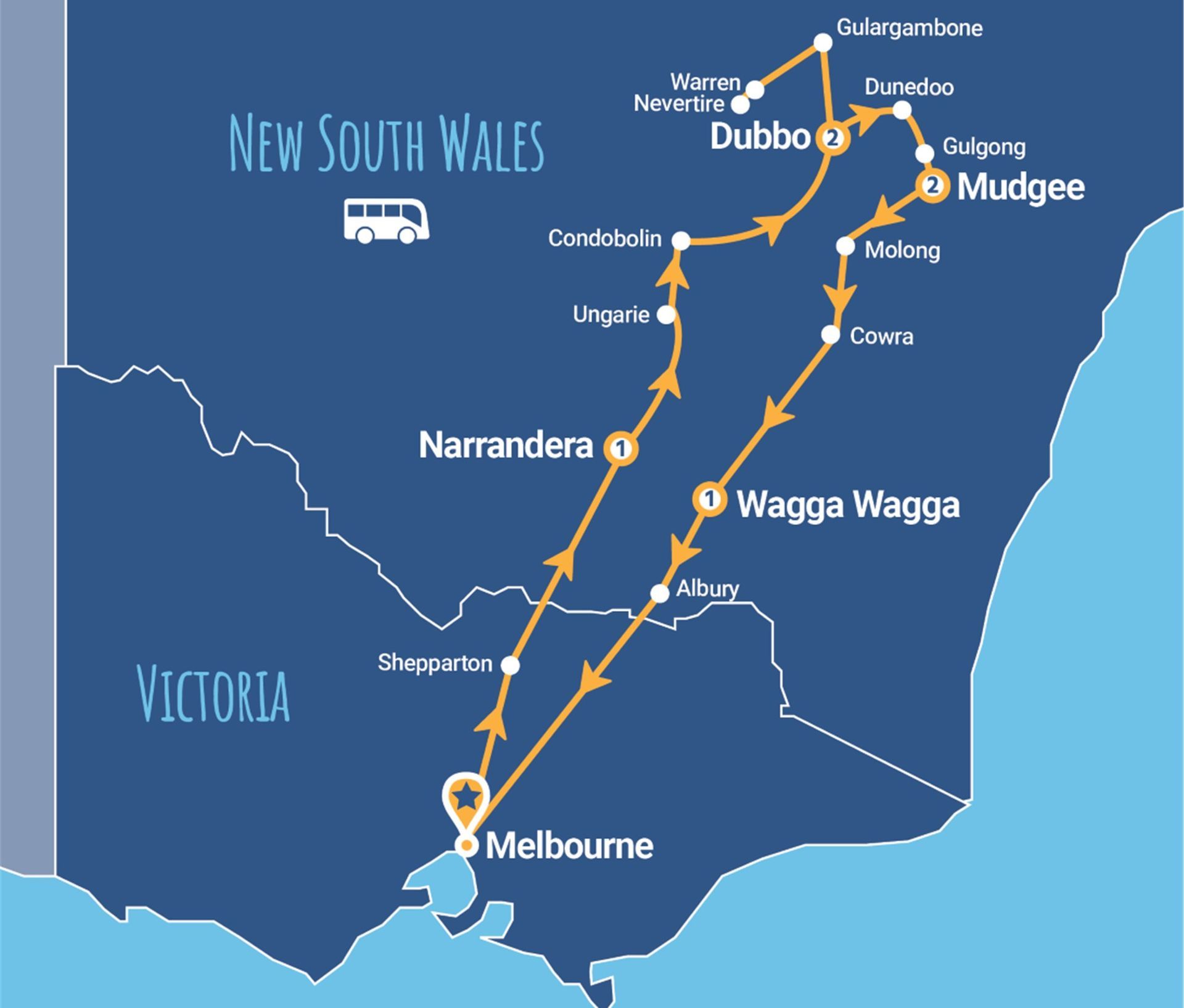 The Big Tennis Racquet, Barellan, Weethalle Silo Art, The Big Football Ungarie, Condobolin, Dundullimal Homestead Dubbo, Gulargambone Water Tower Art, Warren Water Tower Art, Nevertire Water Tower Art, Dunedoo Silo Art, Henry Lawson Centre Gulgong, Gulgong Pioneer Museum, Local Guide Mudgee, Mudgee Honey Haven, Gooree Park, Robert Stein Winery, Molong Water Tank Art, Cowra and Albury.