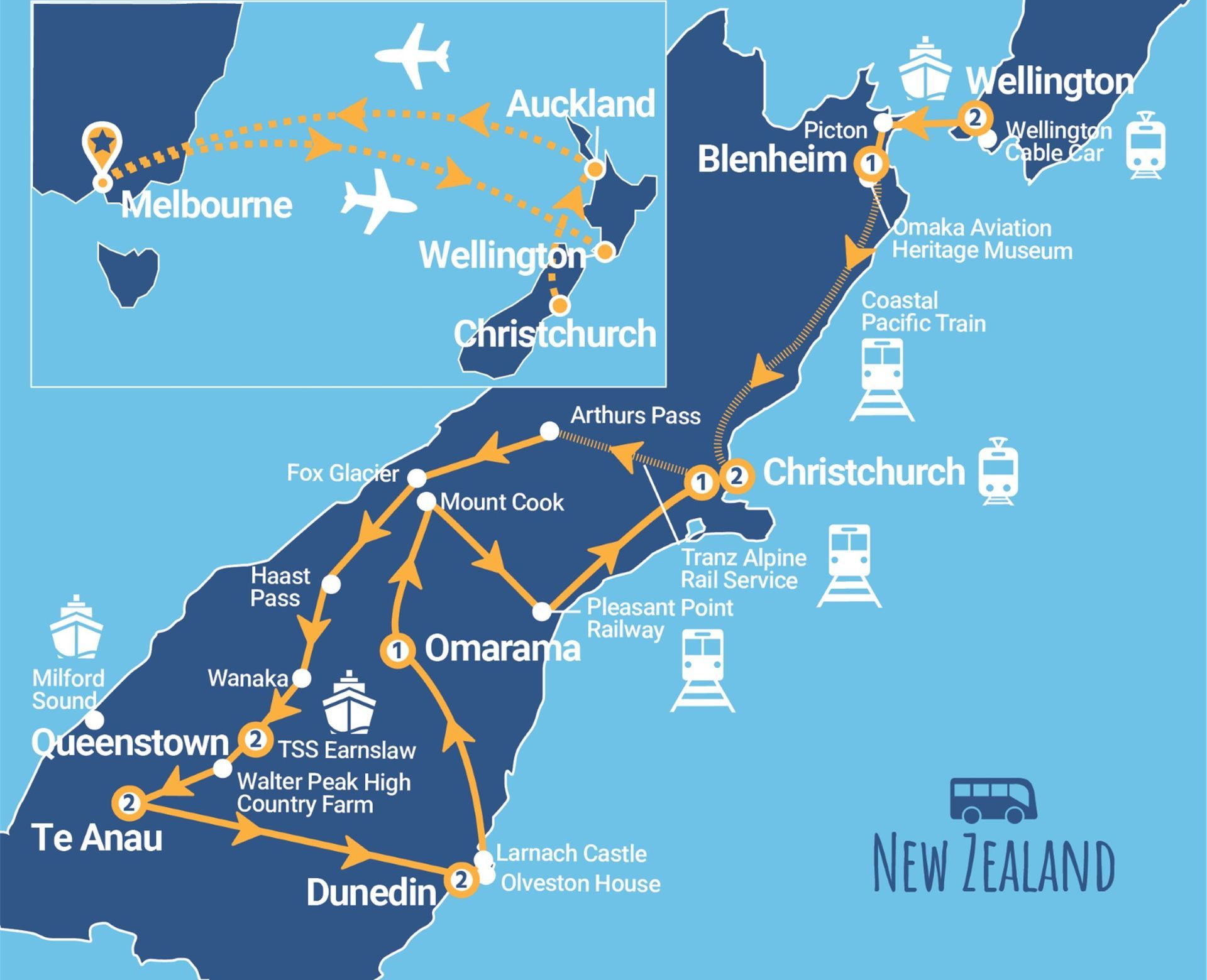 Wellington city Sightseeing Tour, Te Papa National Museum, Wellington Botanical Gardens, Wellington Cable Car, Wine Tasting and Lunch at Vineyard, Omaka Aviation Heritage Museum, Christchurch City Sightseeing Tour, Mona Vale Estate, Fox Glacier, Haast Pass, Queenstown, Walter Peak High Country Farm, Milford Sound, Dunedin City Sightseeing Tour, Olveston House, Glenfalloch Gardens and Larnach Castle.