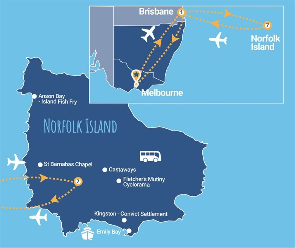 Economy flights from Melbourne to Brisbane to Norfolk Island and return.