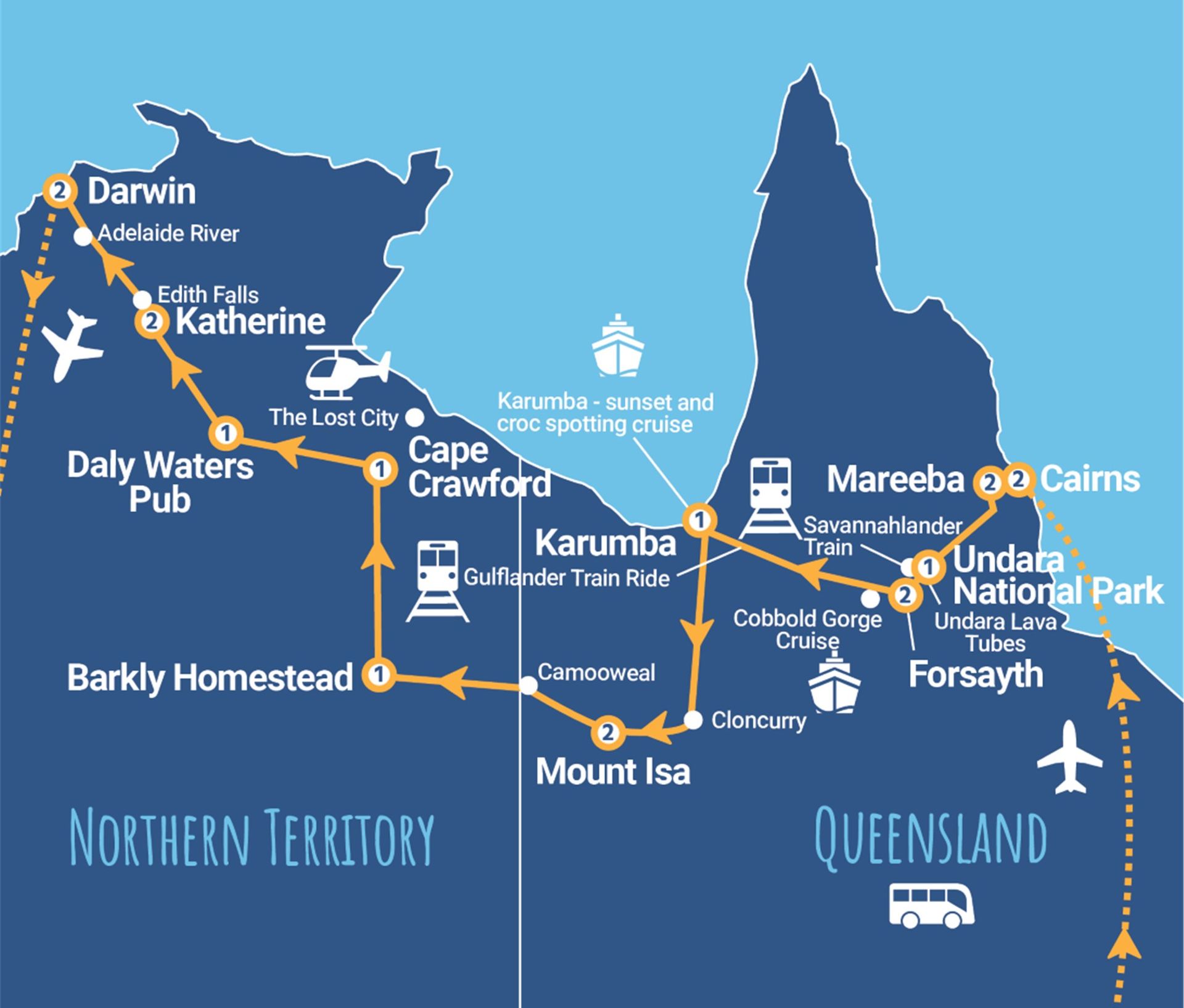 2 nights in Cairns, Mareeba, Forsayth, Mt Isa, Katherine and Darwin