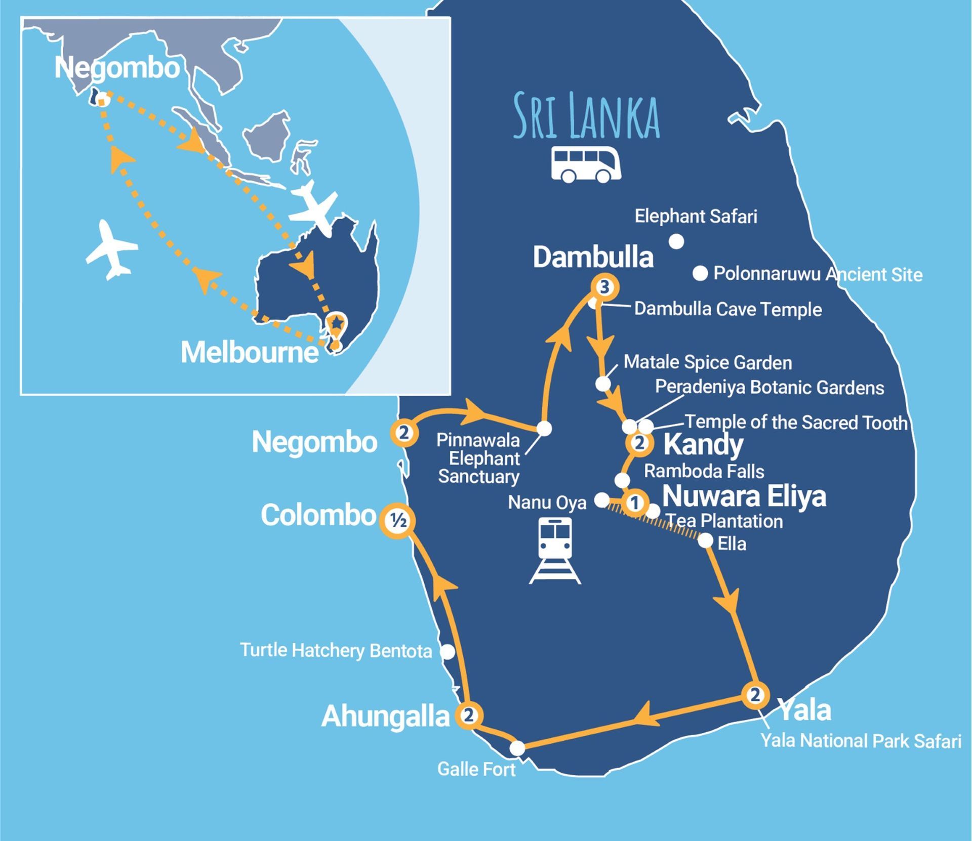 Tour of Negombo, Pinnawala Elephant Orphanage, Polonnaruwa Ancient Site, Minneriya National Park Safari, Dambulla Cave Temple, Spice Gardens Matale, Cooking Demonstration, Visit to a Local School, Peradeniya Botanic Gardens, Gem Factory Kandy, Kandy Dancers & Cultural Show, Temple of