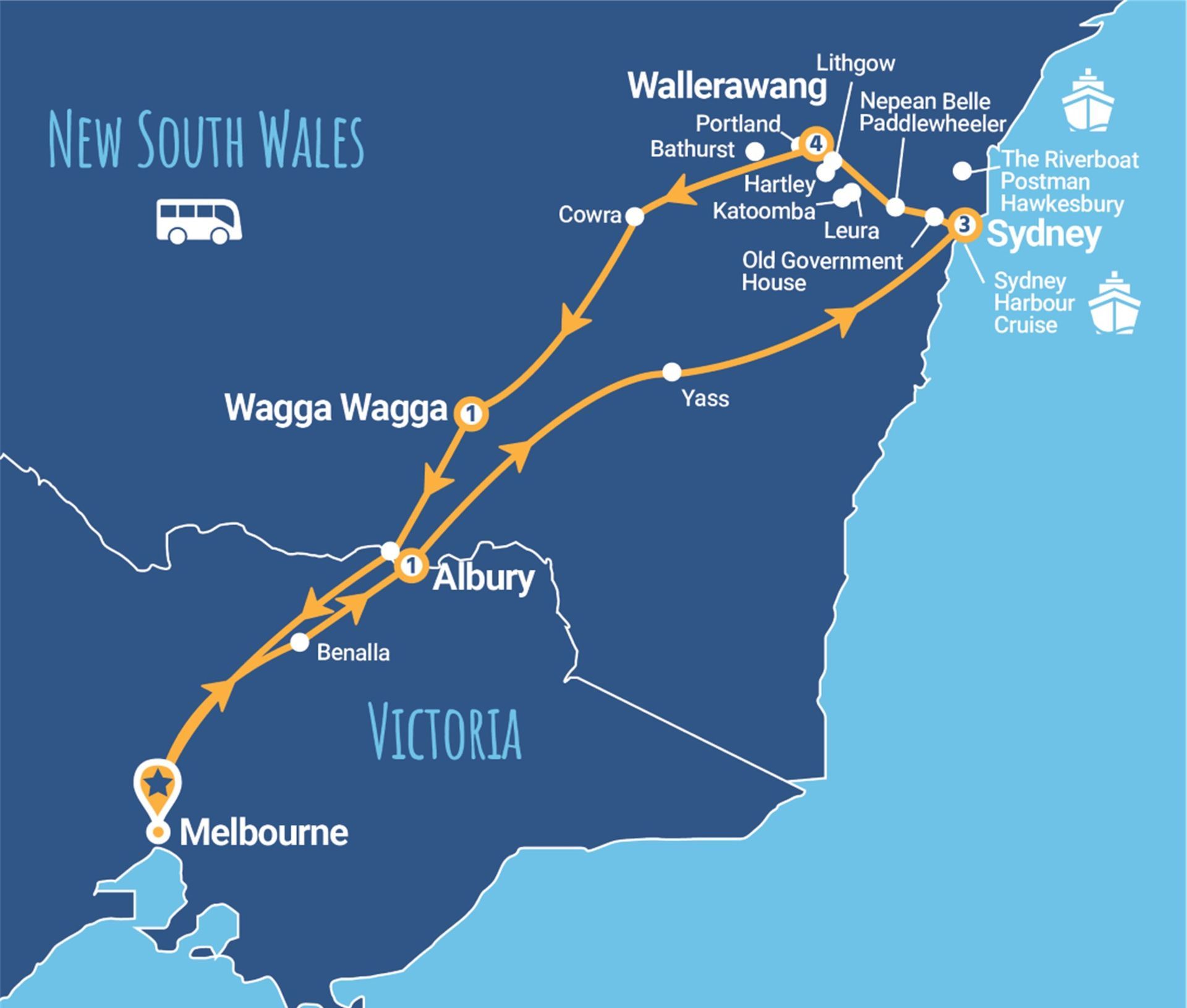 Weary Dunlop Memorial, Benalla, Mural Art Benalla, Humes Cooma Cottage Yass, Old Government House, Guided tour of Sydney, Auburn Botanic Gardens, Govetts Leap Lookout, Bygone Beautys Treasured Teapot Museum, The Three Sisters, Cableway & Skyway Scenic World, Abercrombie House Bathurst, Guided tour of Bathurst, Mt Panorama Race Circuit, Hartley Historic Village, Tour of Lithgow, Portland Silos and Japanese Garden & Cultural Centre Cowra.