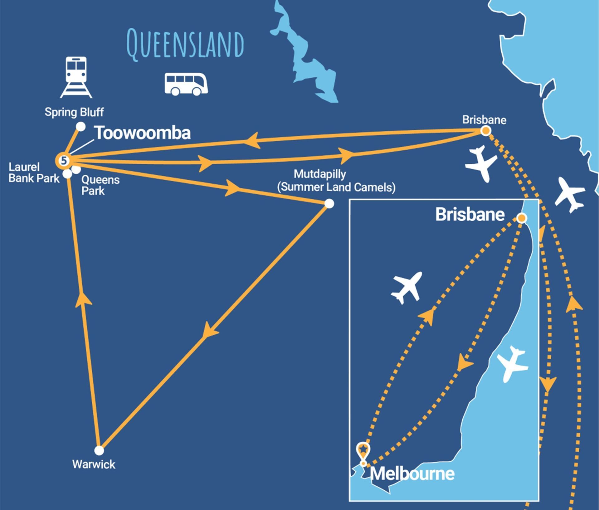 Queens Park, Laurel Bank Park, Ju Raku En Japanese Garden, Toowoomba Empire Theatre, Downs Steam Heritage Rail Museum, Cobb & Co Museum, Toowoomba Carnival of Flowers Local Gardens, Glengallan Homestead, Warwick Historical Society Museum, Summer Land Camel Farm, Grand Central Floral Parade, Picnic Point Lookout, Spring Bluff Railway Station and Peacehaven Botanic Park.