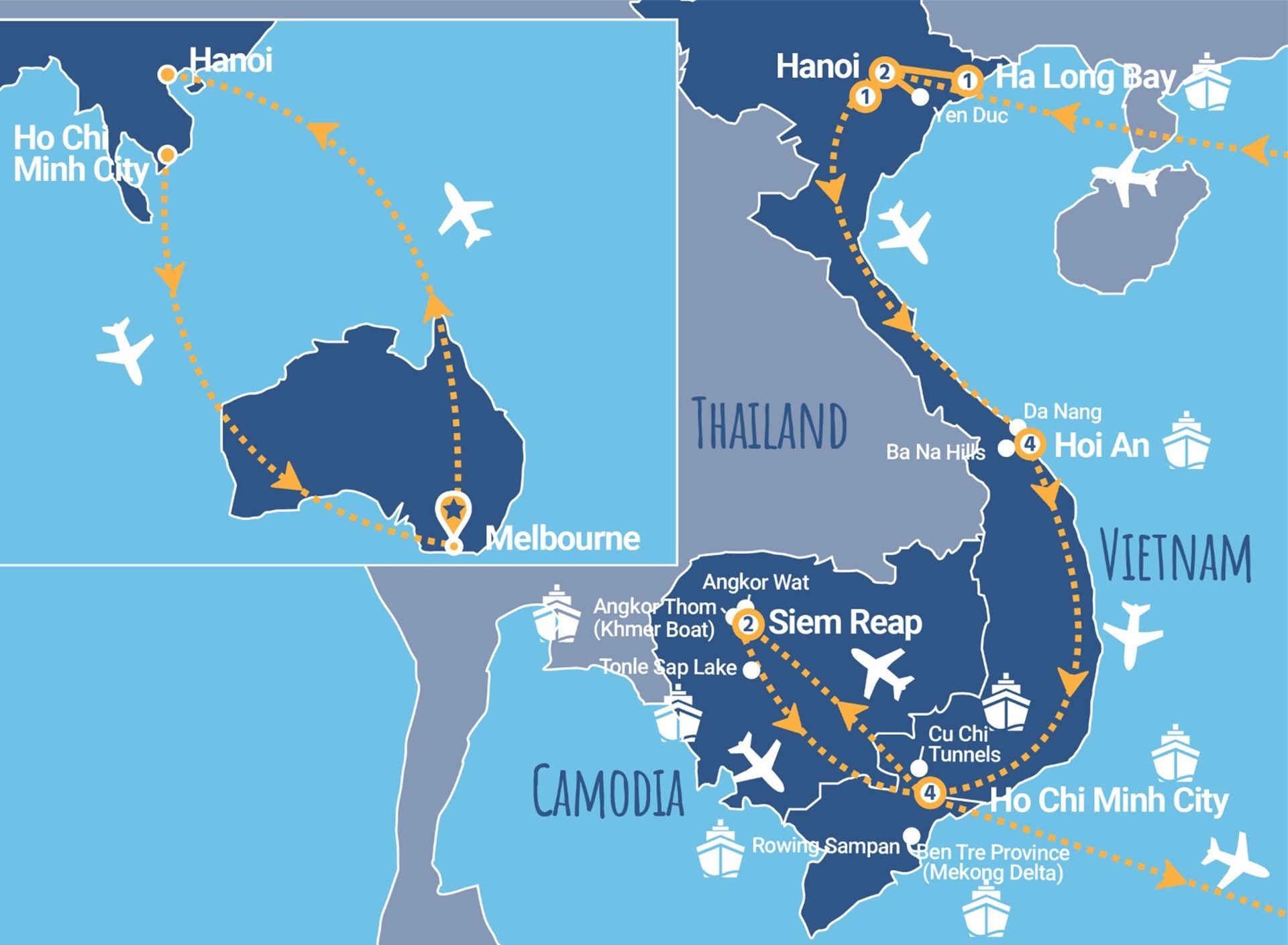 Economy International flights from Melbourne to Hanoi, Vietnam; Saigon to Siem Reap, Cambodia; Siem Reap to Melbourne.
