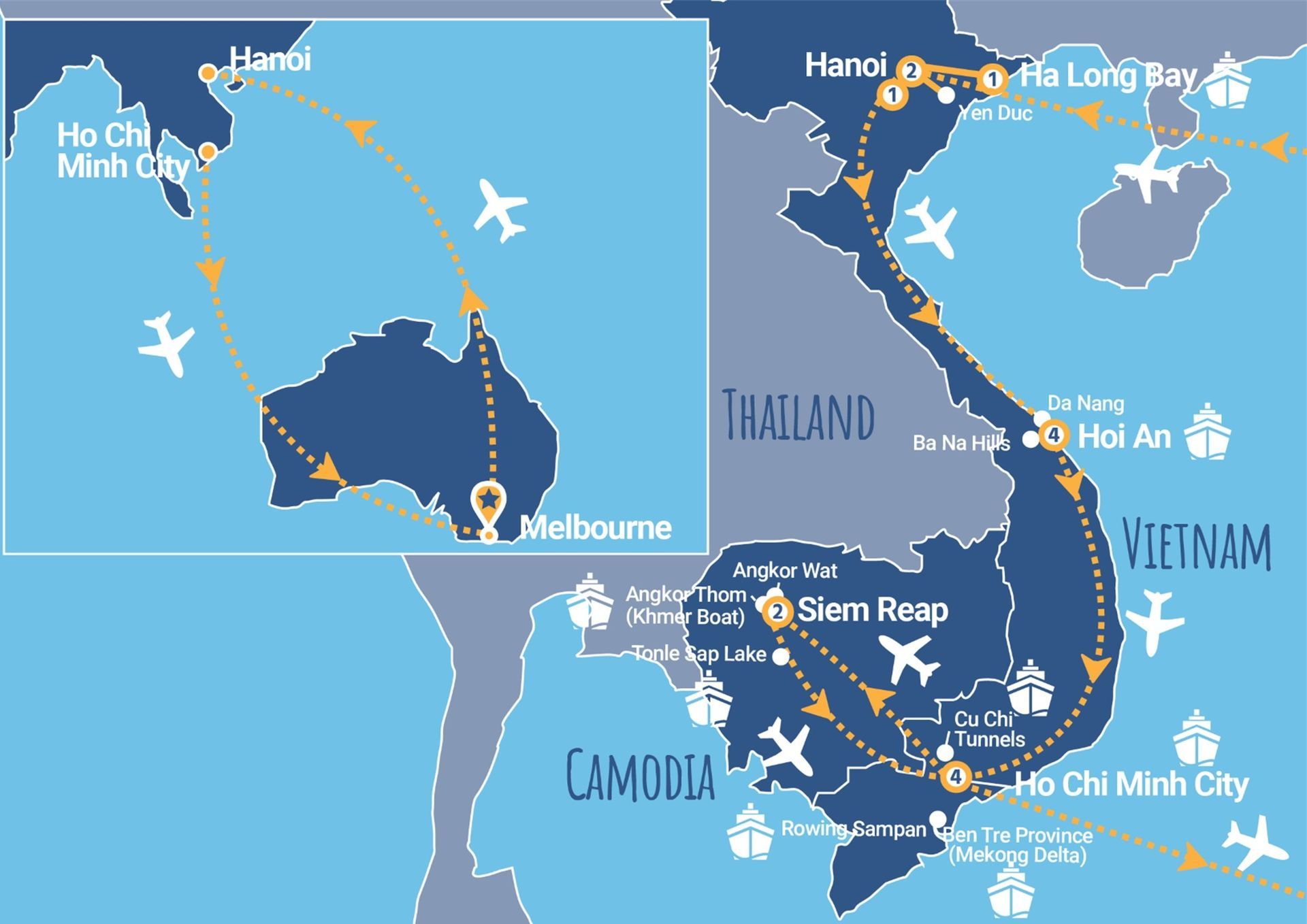 Hanoi City Sights Guided Tour, Ho Chi Minh’s Mausoleum, Gardens of the Presidential Palace and Uncle Ho’s Humble House, The Vietnam Museum of Ethnology, Cyclo Ride, Activities on Ha Long Bay including Cooking Class, Tai Chi and Cave Walk, Visit Yen Duc Village, Water Puppet Show, Hoi An Ancient Town Walking Tour, Lantern Creation Hoi An, Cable Car to Ba Na Hills, The Golden Bridge, Sun World, Ho Chi Minh City Guided Tour, Cu Chi Tunnels Tour, Day Tour to the Mekong Delta, Brick Factory Coconut Workshop and Mat Workshop, Temple of Angkor Wat, Temple of Angkor Thom