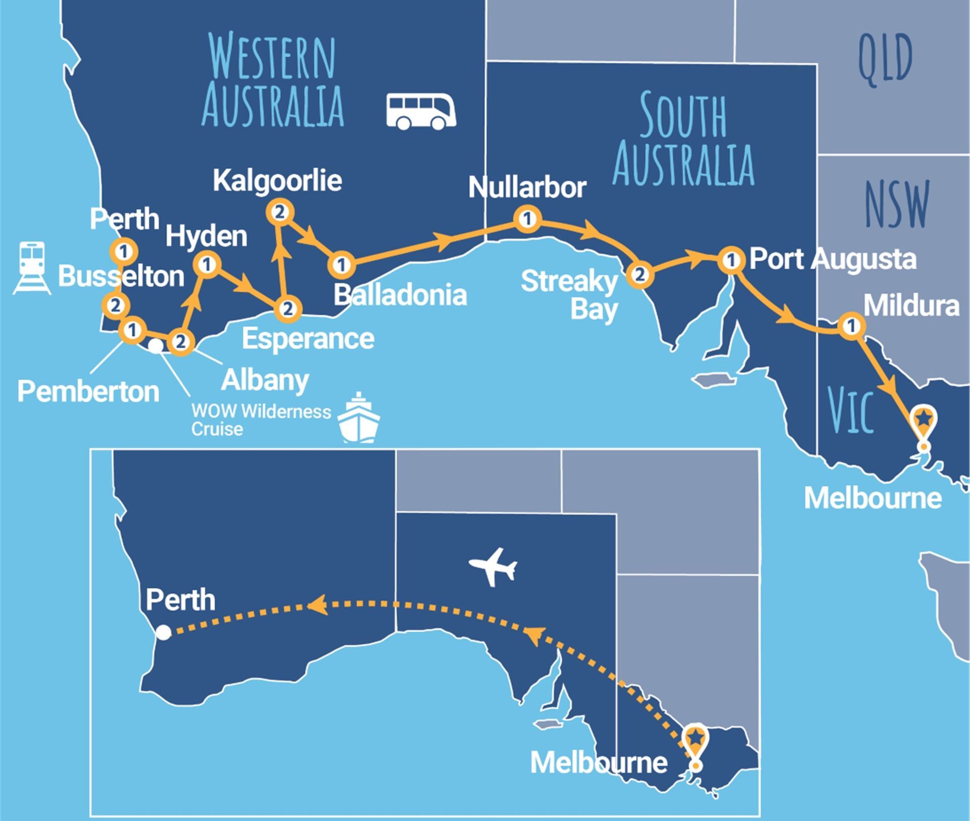2 nights in Busselton, Albany, Esperance, Kalgoorlie and Streaky Bay